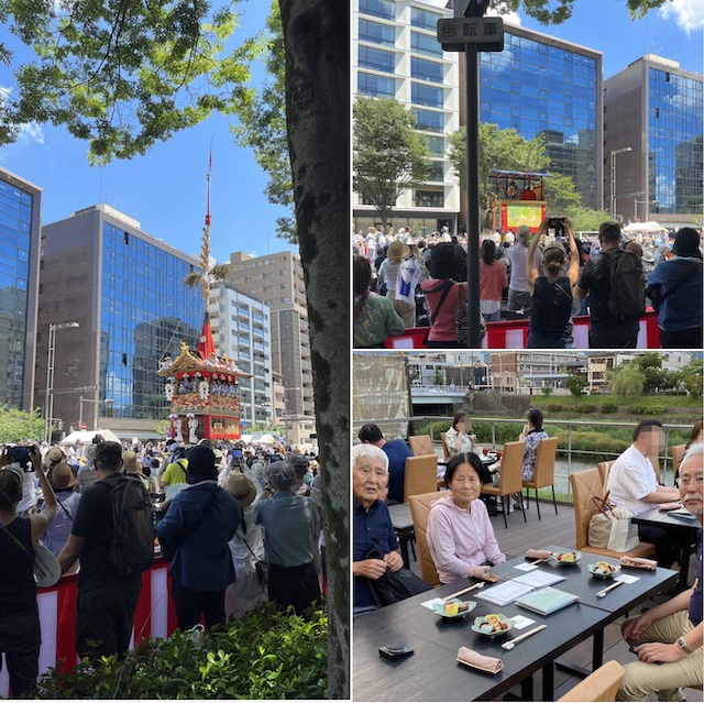 - 7/17 香川から出てきた両親や長女を連れて祇園祭の山鉾巡行へ。猛暑日ながらもなんとか日陰を確保し、1時頃まで楽しんだ。夕食は床へ。川面から流れてくる風に一服の涼を感じていると、三条大橋には神幸祭の神輿の列が通りだした。「ホイット、ホイット」と勇壮な掛け声が響きわたる。優美な昼の巡行とは異なるもう一つの祇園祭。なんとも贅沢な一日になった。