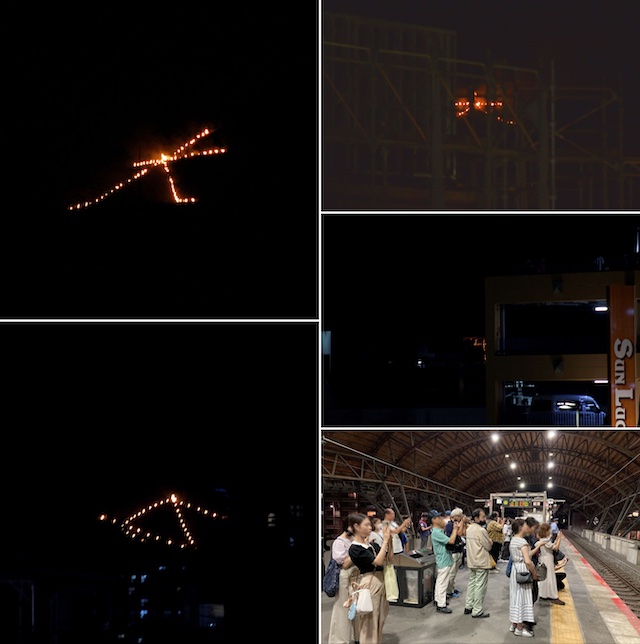- 8/16 五山の送り火を見にJR二条駅に。近年は大文字、舟型、左大文字、鳥居が見える場所として有名になりつつあり、今日は警察官も動員されていた。