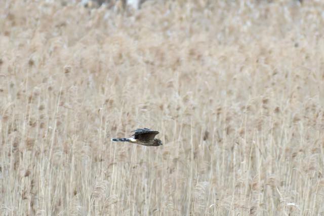 年末不発で悔しい思いをした鵜殿のハイイロチュウヒに再挑戦した。今回は数人のカメラマンがいて出ている雰囲気。日の入り近くまで粘ったが、出そうにない。諦めて撤退中、葦原を振り返ったところ、突然飛び出した。シャッタースピードの設定を間違えピンぼけ連発したのが残念だ。