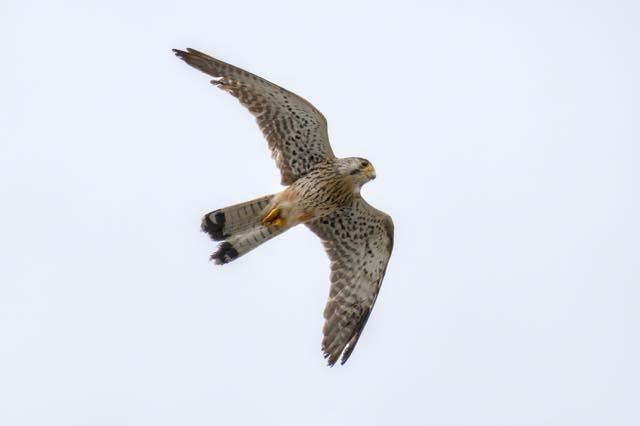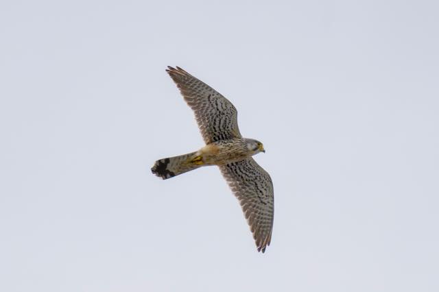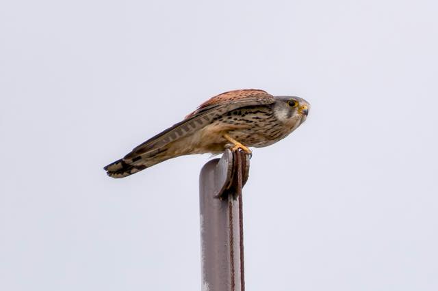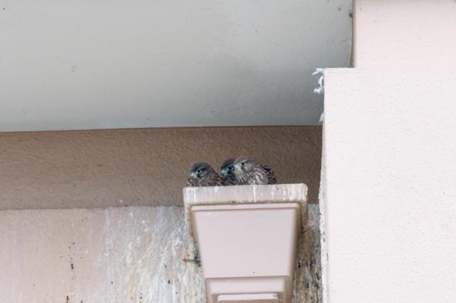 チョウゲンボウの営巣地。3週間ぶりに訪れたところ、巣立ちが始まっていた。3羽ほどが巣から出ていて、3羽はまだ巣に残っていた。 親鳥の羽根はこの間の子育てですっかりボロボロになっていた。今日の獲物はネズミであった。