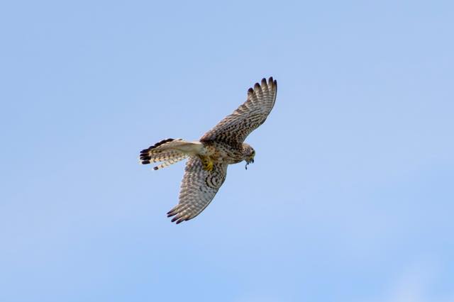 親鳥。口にはトンボ、足には何かを捕まえて子どもたちに運んでいる。