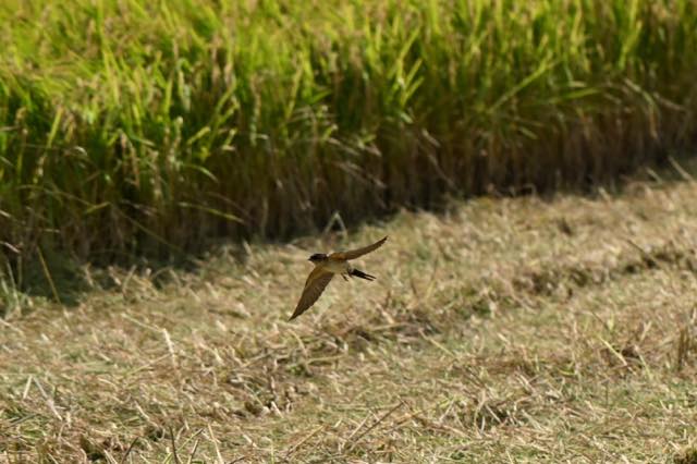 稲刈り時に飛び出してくる虫を狙ってコシアカツバメが集まっている。
