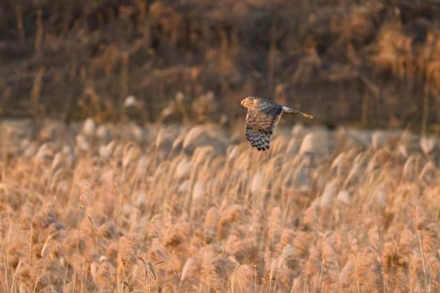 ハイイロチュウヒの塒入り。1時間半待って一瞬だけで、ピンボケ。今日はノーカンかな。